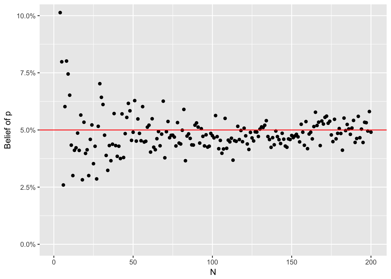 Below I define such a process with a probability of heads on any given flip of 5 percent. I encode basically weak to no special belief of the “magical unknown parameter,” 5 percent.