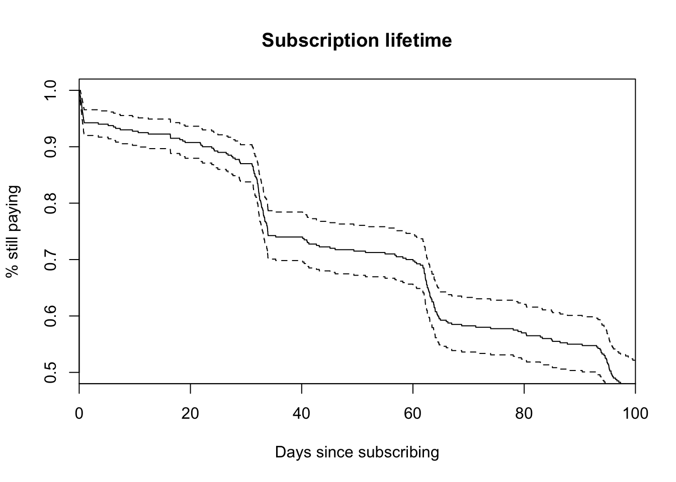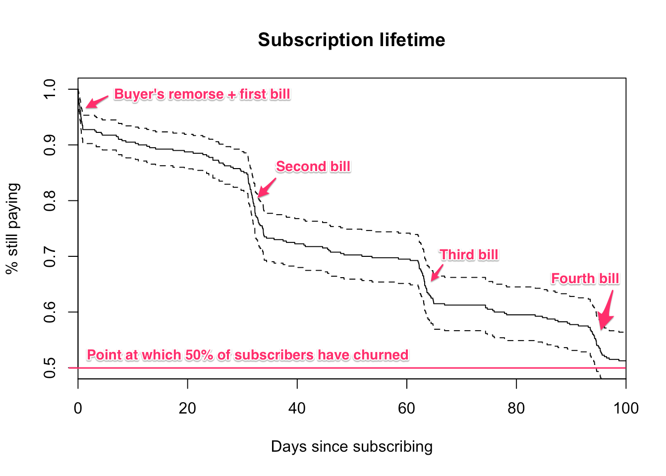 Subscription churn usually clusters around the first day and each subsequent bill. “Buyers remorse” is a common phrase for early churn and it’s no surprise that subscribers churn when presented with a bill. It’s important to model these clusters well because they’re where most customers churn.