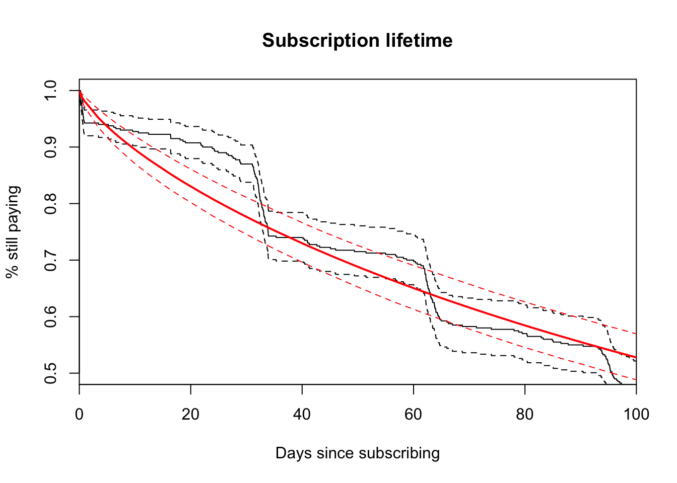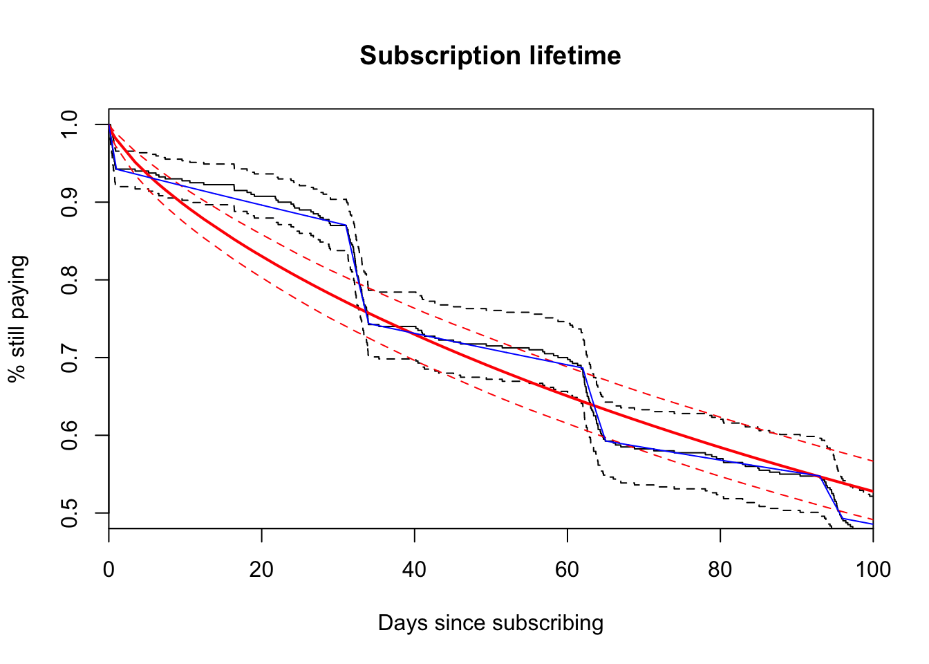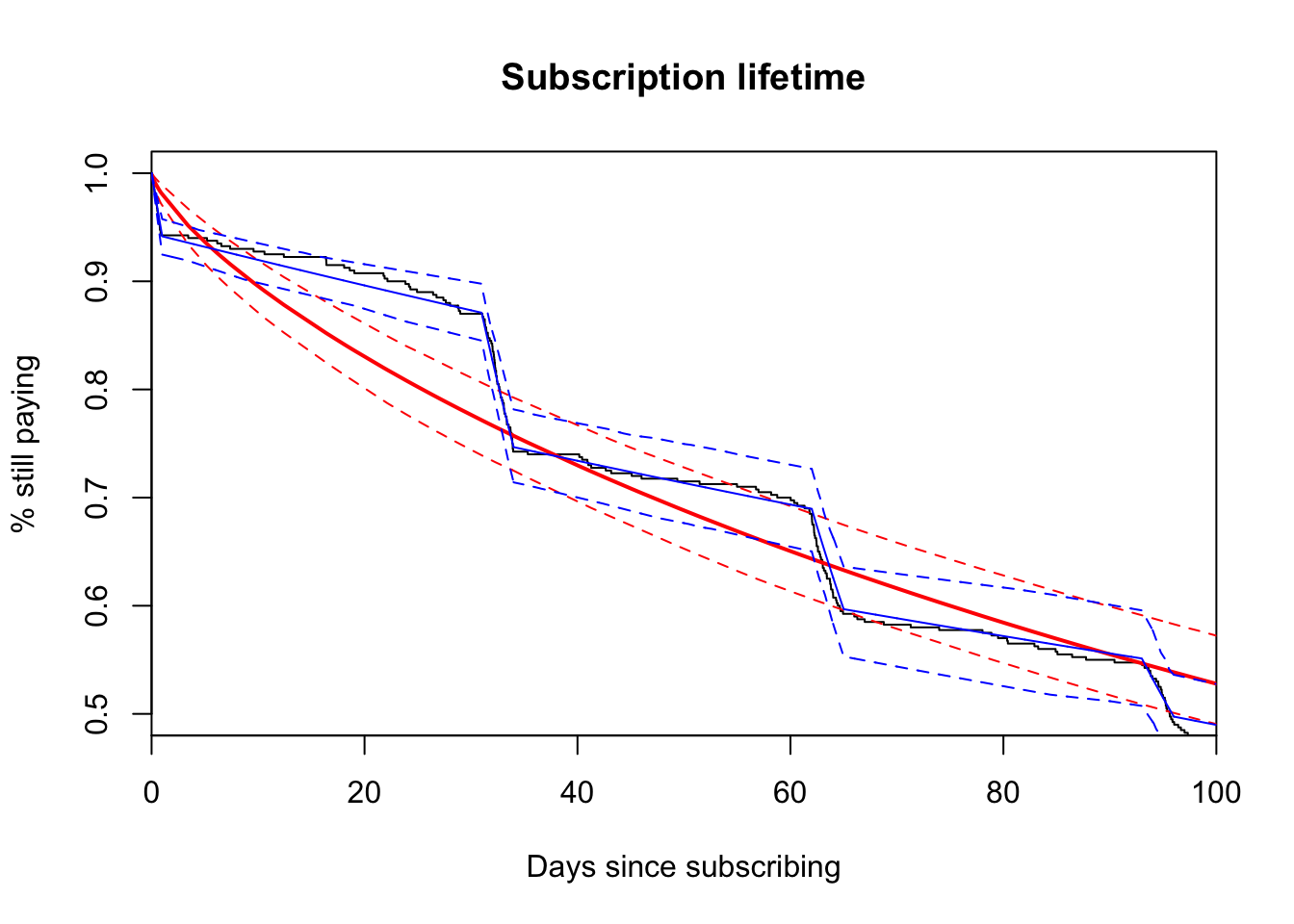 Very cool. Now we’re on our way to accurately measuring churn. The piecewise-constant model assumes a steady exponential rate between each interval. It is a parametric model. This isn’t a terrible assumption with real subscription data, though and it gives the problem tractibility. If you want to deploy an experiment that targets days 31 - 34 (when customers receive the first bill), using a parametric model will yield statistical power for a faster turnaround. Also, we can see that the generalized gamma distribution, a distribution that includes many other distributions, can’t cope with the quick drops caused by buyer’s remorse and bills. The piecewise-constant model yields a great fit for this type of data and can enable high-precision experiments.