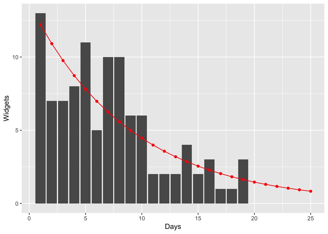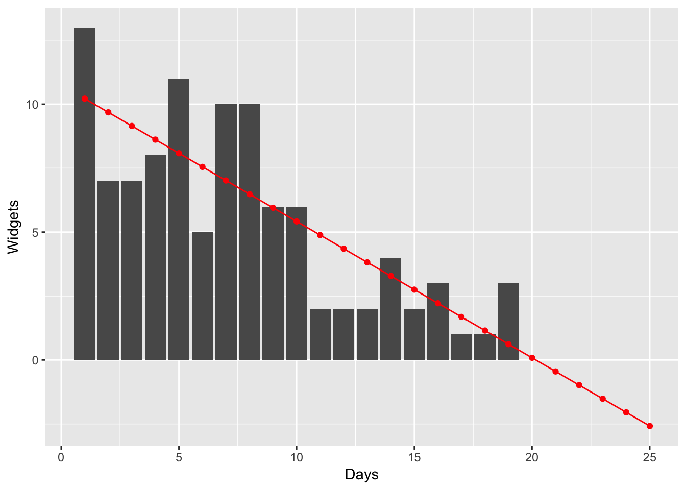 (data.frame(days = days, widgets = widgets) -> d)# install.packages("ggplot2") # uncomment and run first