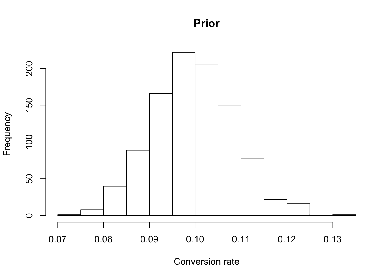 rbeta(1e3, 1e3*0.1, 1e3*0.9) %>% hist(main = "Prior", xlab = "Conversion rate")
