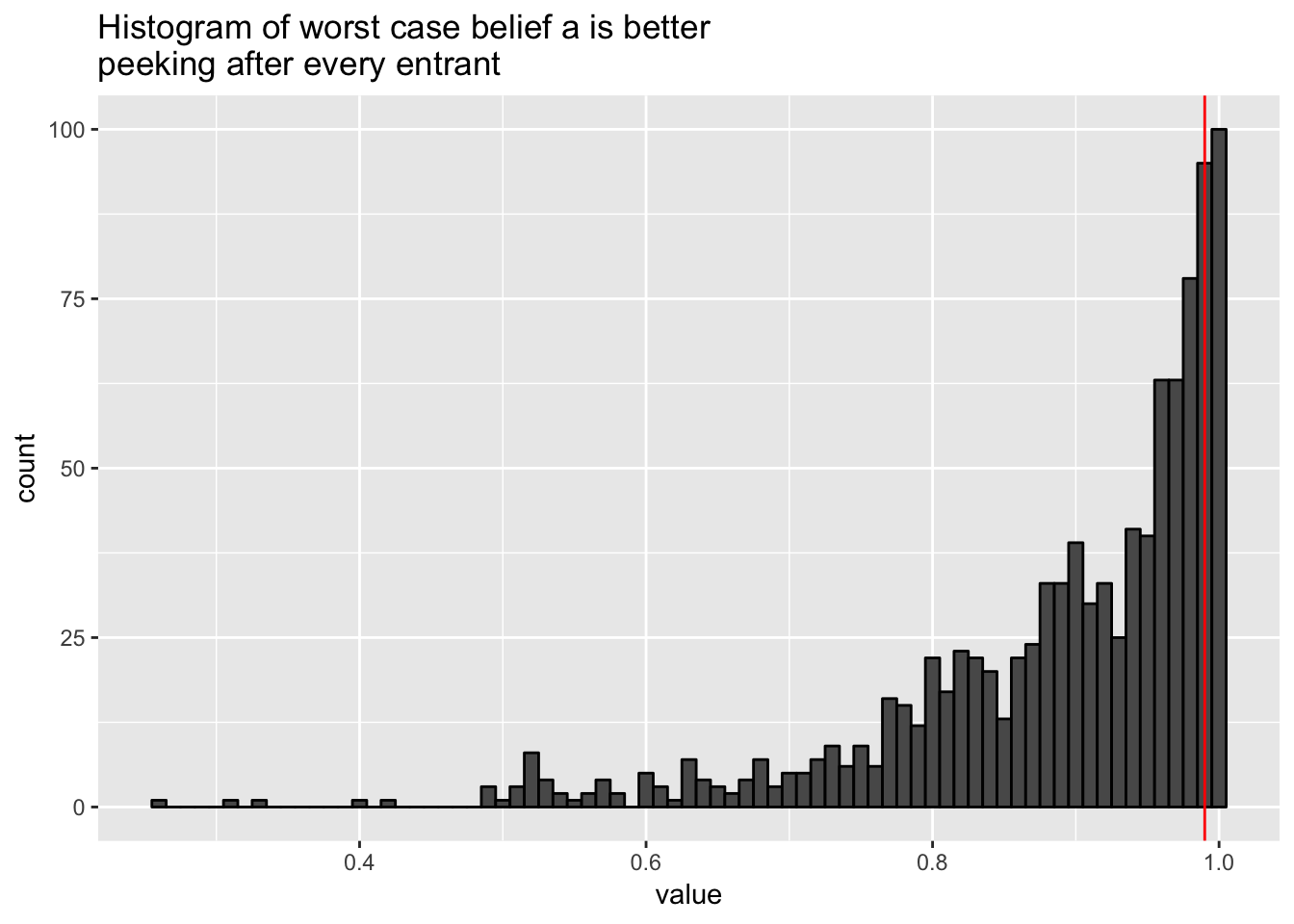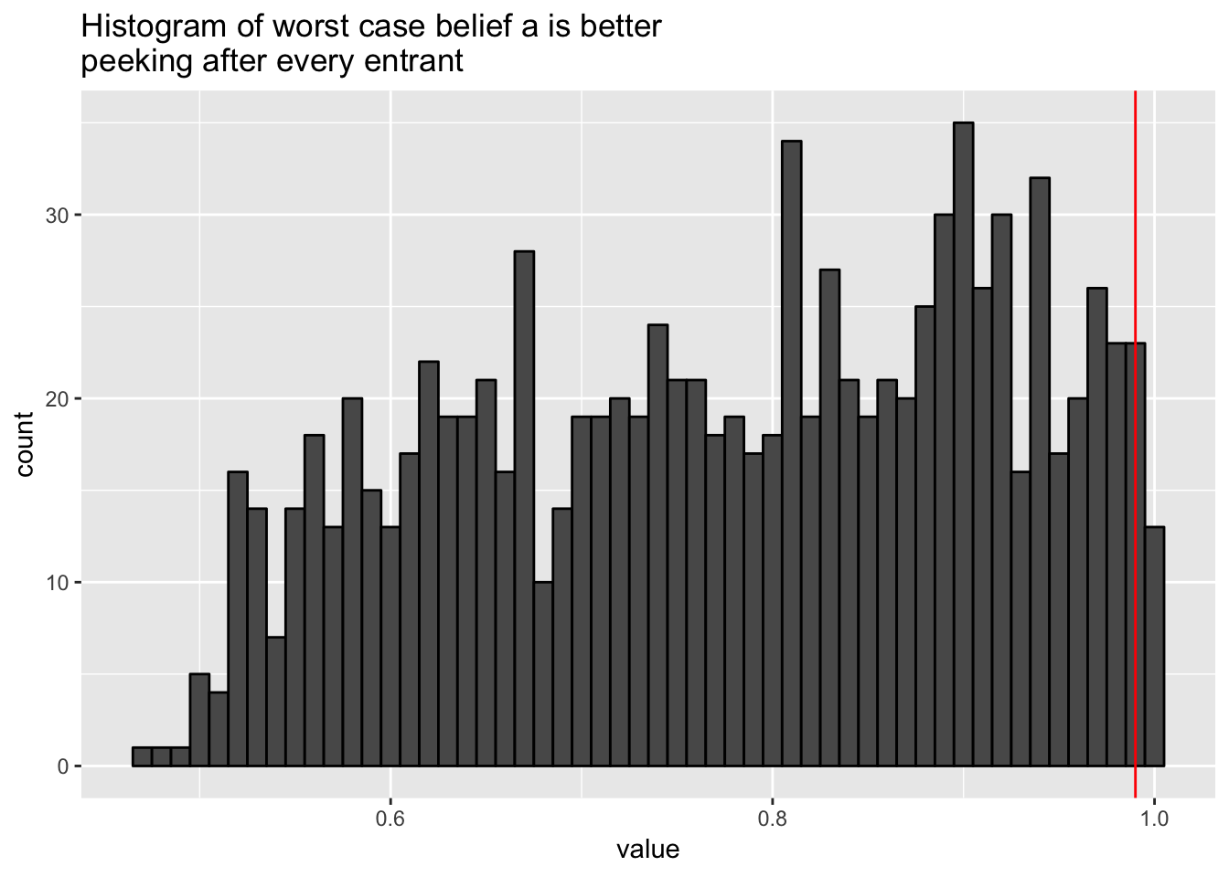 ggtitle("Histogram of worst case belief a is better\npeeking after every entrant")