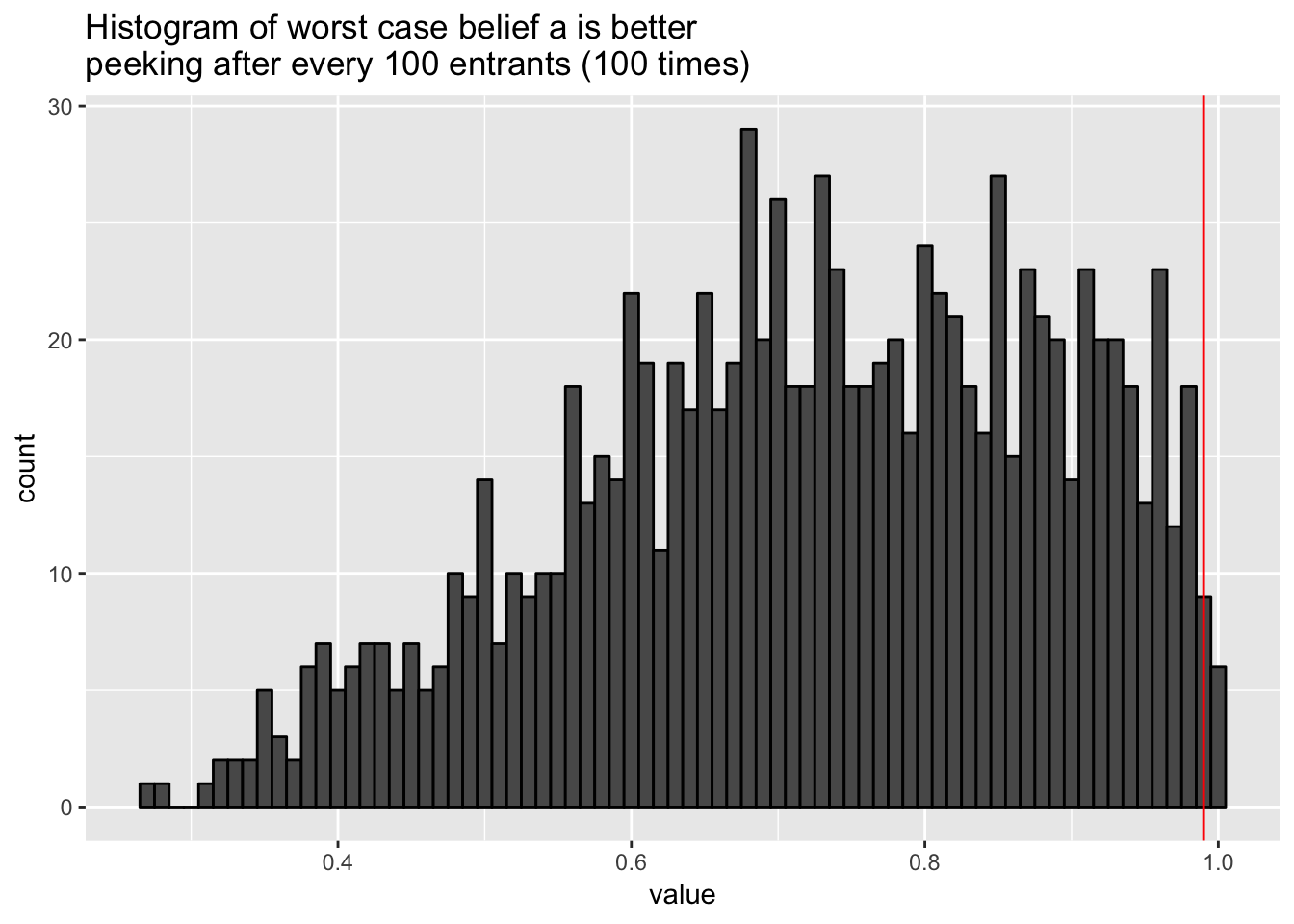 perform_experiment(1e4, 0.1, 0.102, entrants_to_peek_after = 100,