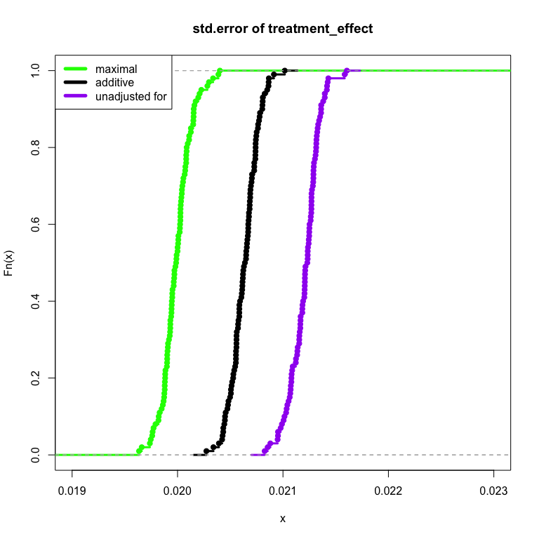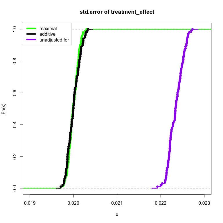 In particular I focus on the size of standard error of the treatment effect in each of the three cases. A smaller treatment effect standard error represents more precision per amount of sample size: a faster experiment. I show in the case of no actual treatment interaction, the method fails safe and produces about the same standard error as the “additive” model.