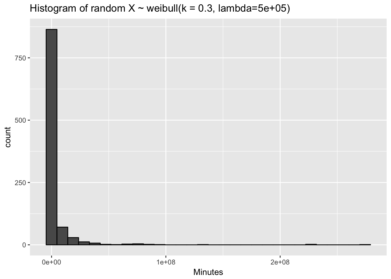 ggtitle(glue("Histogram of random X ~ weibull(k = { shape }, lambda={ quantile_632 })")) +