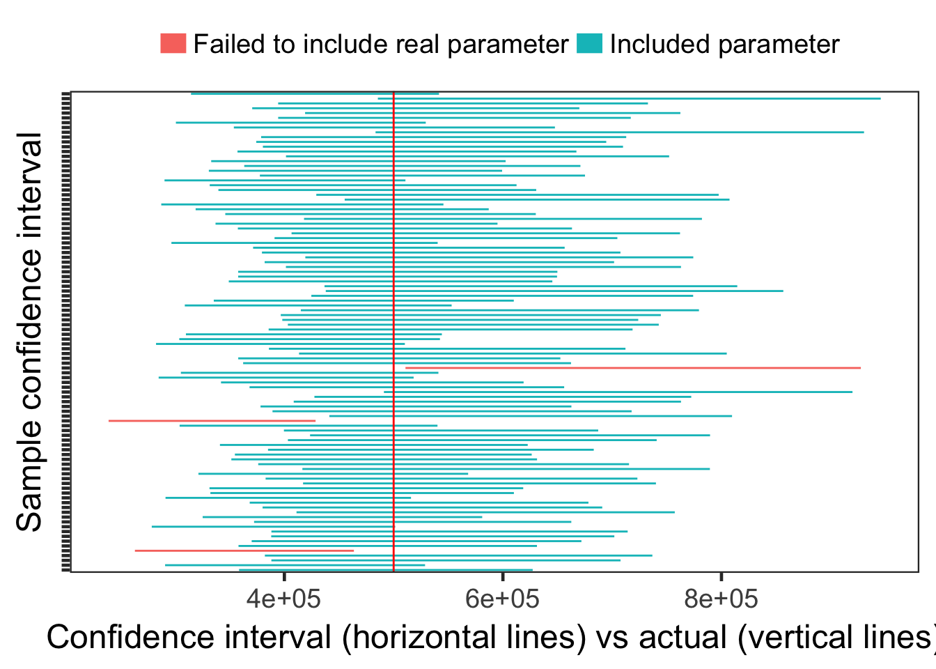 xlab("Confidence interval (horizontal lines) vs actual (vertical lines)") +